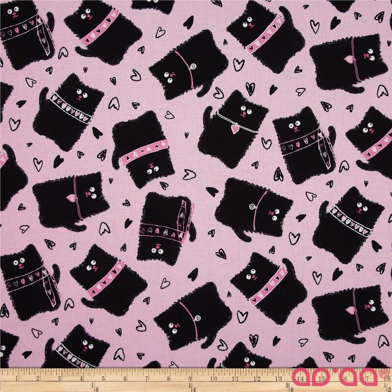 Tecido de Algodão com Gatos Pretos e Corações em Fundo Rosa Claro