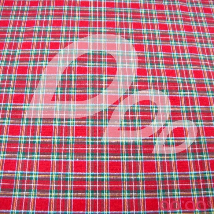 Tecido de Algodão em Xadrez com Quadrados Verde, Amarelo, Azul e Branco em Fundo Vermelho