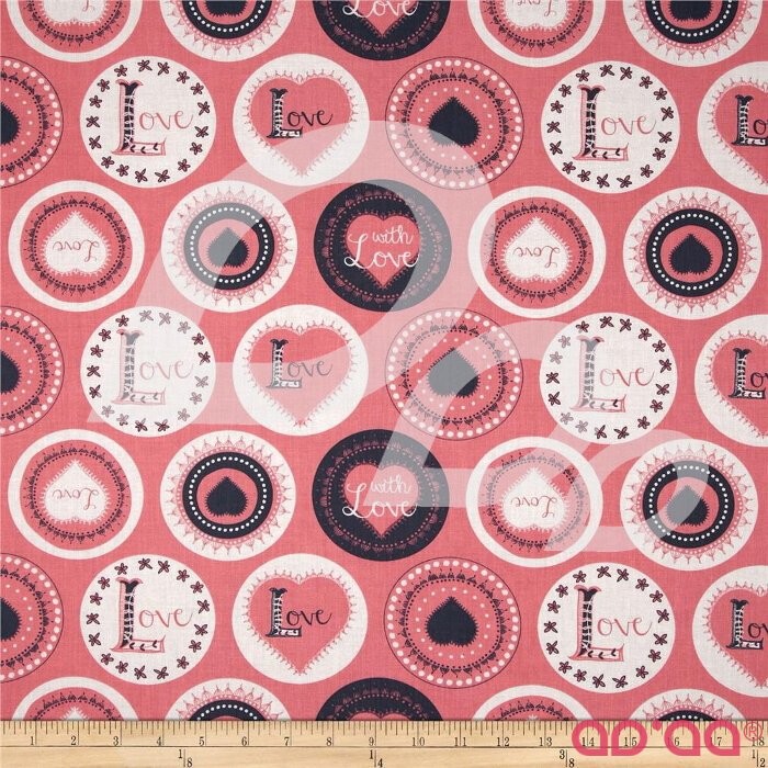 Tecido de Algodão com Letra 'L' e Love com Bolas e Corações Brancos, Pretos em Fundo Rosa