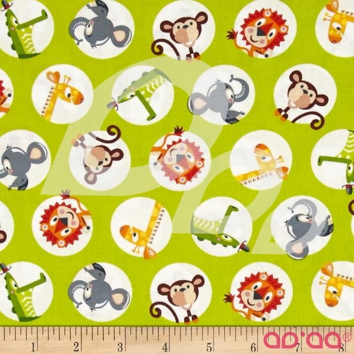 Tecido de Algodão com Leão, Macaco, Girafa, Elefante e Crocodilo em Fundo Verde Claro