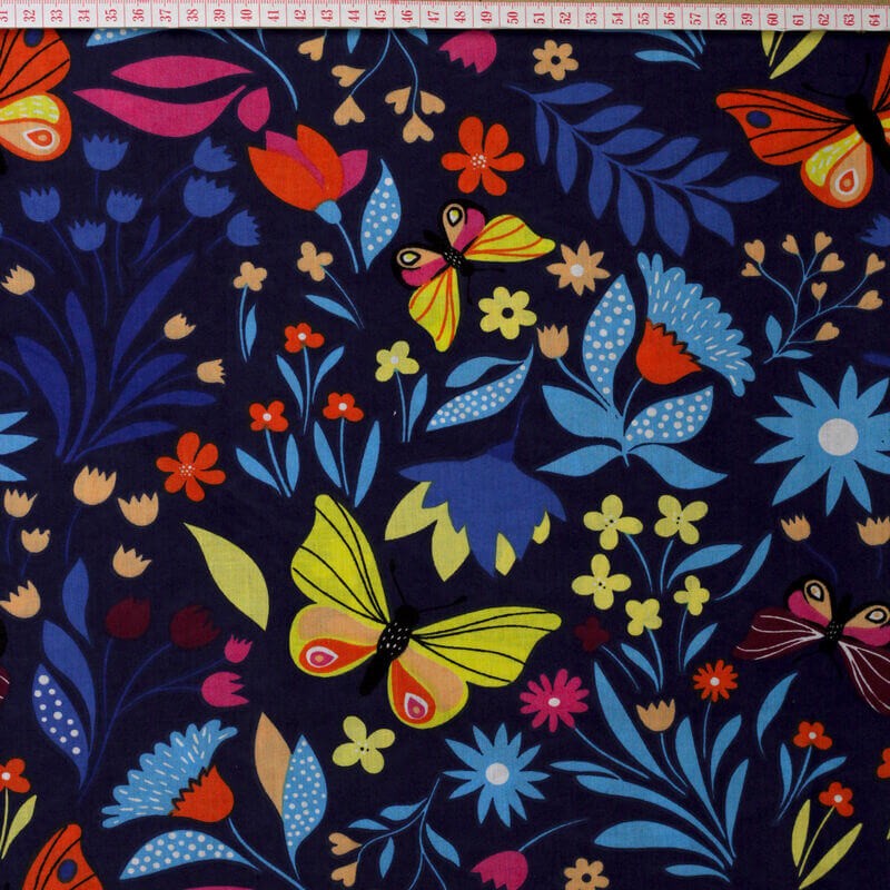 Tecido de Algodão com Borboletas e Flores em Fundo Azul Escuro Marinho